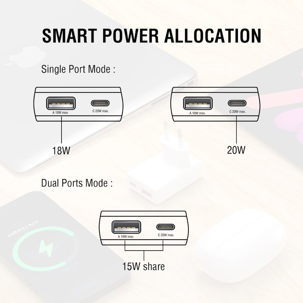 - Захранване за ел. мрежа с един USB-A изход и един USB-C, като и двата притежават технология за бързо зареждане QualComm Quick Charge 3.0 (QC 3.0)